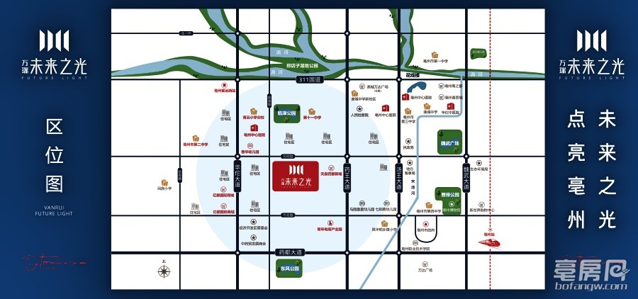 项目位于亳州市谯城区,东临药王大道、西沿振谯路,南至芍花路,北靠光明路,路网通达四至。整个项目总占地约56亩、总建筑面积约92993㎡、商业约4245㎡。容积率为2.0,绿地率高于35%,整个项目由5栋18-26层高层、4栋9-11层洋房、3栋沿街商业、1所幼儿园组成。总户数582户,机动车车位814个(地上244、地下570),配比达到1:1.39,非机动车停车位411个(地上245、地下166)。项目采用现代简约风格设计,讲究造型比例适度、空间结构图明确美观,强调外观的明快、简洁。体现了现代生活快节奏、简约和实用,但又富有朝气的生活气息。规划依循复合地产形态不仅打破了单一的建筑形式,让社区体现韵律美、层次感,提升楼盘档次,更为亳州消费者创造出充分体现生活感受和文化价值的复合人居生活。外观上采用真石漆、米色石材等进行搭配,体现高端楼盘的气质,匹配小区业主的尊贵身份。