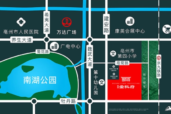 亳州金科府位于南部新城重要位置,周边生活配套成熟,临近万达商圈,近享亳州第四小学,亳州第十幼儿园等优质教育资源,南湖公园、高铁南站、亳州名片——神农谷康美集团等优质配套资源环伺周边;项目北临亳菊路,东临京九西路,西临建安路,南临牡丹路,交通出行十分便利。项目占地面积101569.5㎡,建筑面积257503.25㎡,容积率为2.0,绿化率高达35%,项目楼栋共计28#,产品涵盖建筑面积约105-115㎡阔景高层,建筑面积约130-140㎡低密洋房,项目通过24H健康社区来进行园林塑造,打造一轴、一环、三境、五园空间布局,以芍影之姿开启生活之旅,以现代简约艺术形式结合花影元素,打造归家的仪式感,列植高大乔木打造浪漫的林下归家路,多功能复合型社交休闲廊架,树木穿廊生长,光影水景穿插结合,打造具有温度的社区交流休闲空间。让业主真正体验到健康休闲舒适的生活感受。