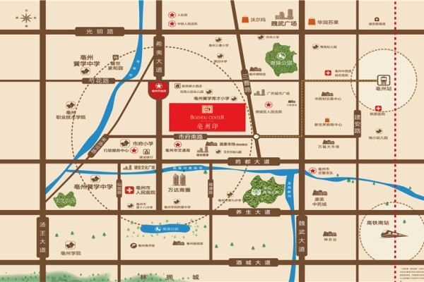 【亳州印】项目地处于谯城区核心位置,是市中心唯一一块可供开发的住宅用地,地块具有唯一性和稀缺性两大豪宅属性。坐拥亳州市核心、项目距离万达广场1.5公里,距离光明路沃尔玛及魏武广场2.1公里,纵享中心城区繁华便利。【亳州印】尽享市府核心商圈,交通便捷、教育、医疗、自然景观资源等配套完善。